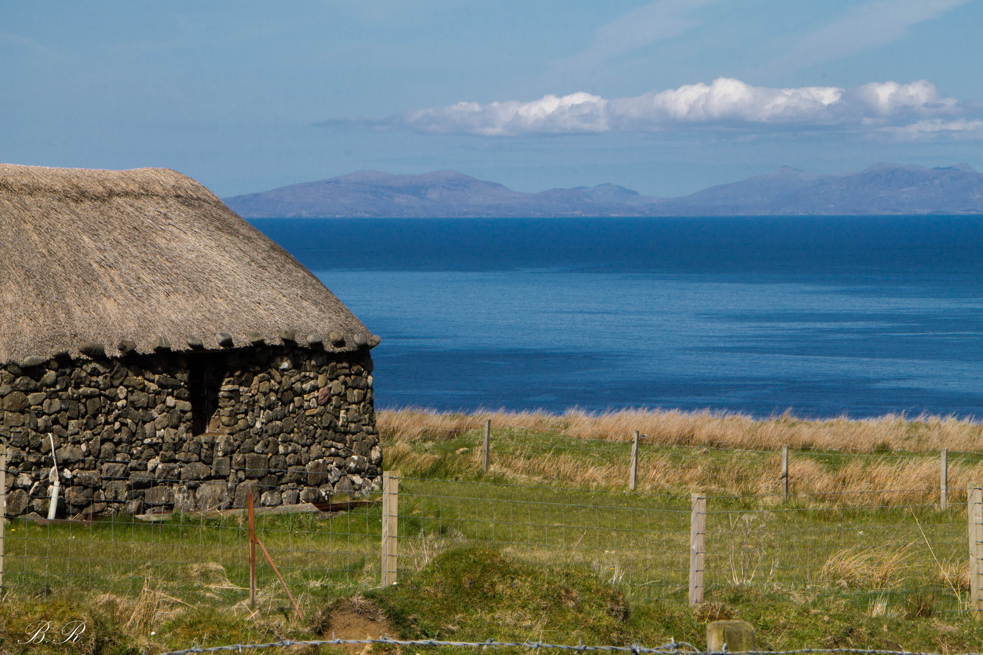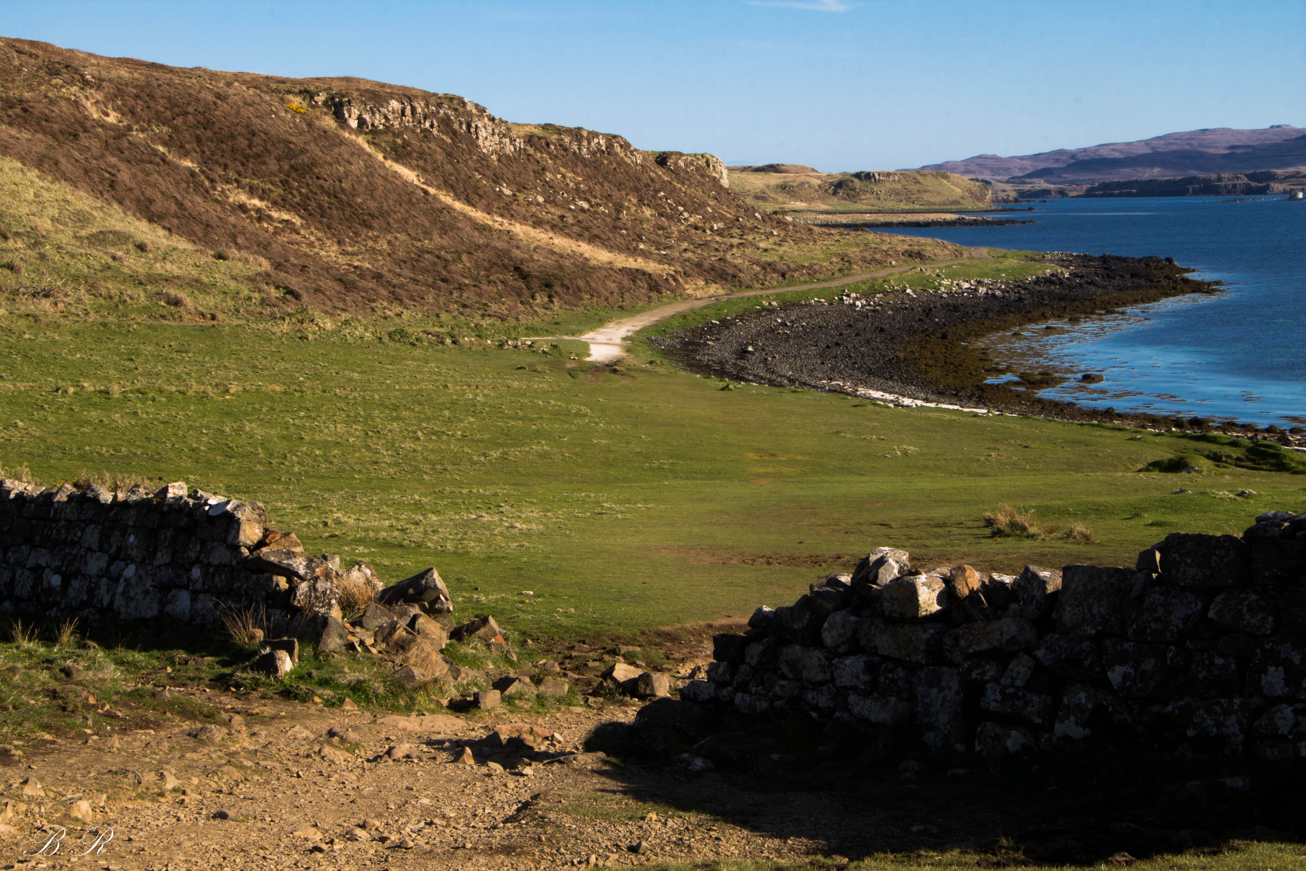 Proseguendo in macchina dopo il Kilmuir Cementery ci si apre davanti un paesaggio verde disseminato di massi con, poco sotto la strada, una lunga spiaggia di sassi scuri. Ci accorgiamo che quei massi, a prima vista disordinati, sono in realtà le fondamenta di una casa e difatti, guardando con più attenzione, notiamo i resti di numerose costruzioni lungo tutta la spiaggia, che formano quasi un villaggio, abbandonato da chissà quanto tempo e per quale motivo. In Scozia si trovano tanti ruderi, di case, di fattorie, di chiese, molti dei quali risalenti ai tempi delle Clearances, quando gli highlander furono costretti ad abbandonare le loro case e ad emigrare in America, Nuova Zelanda o Australia. Si prova un senso di desolazione e tristezza ad osservare questi resti, che un tempo erano la casa ed il rifugio di qualcuno…chissà com’era la vita di chi ci viveva!