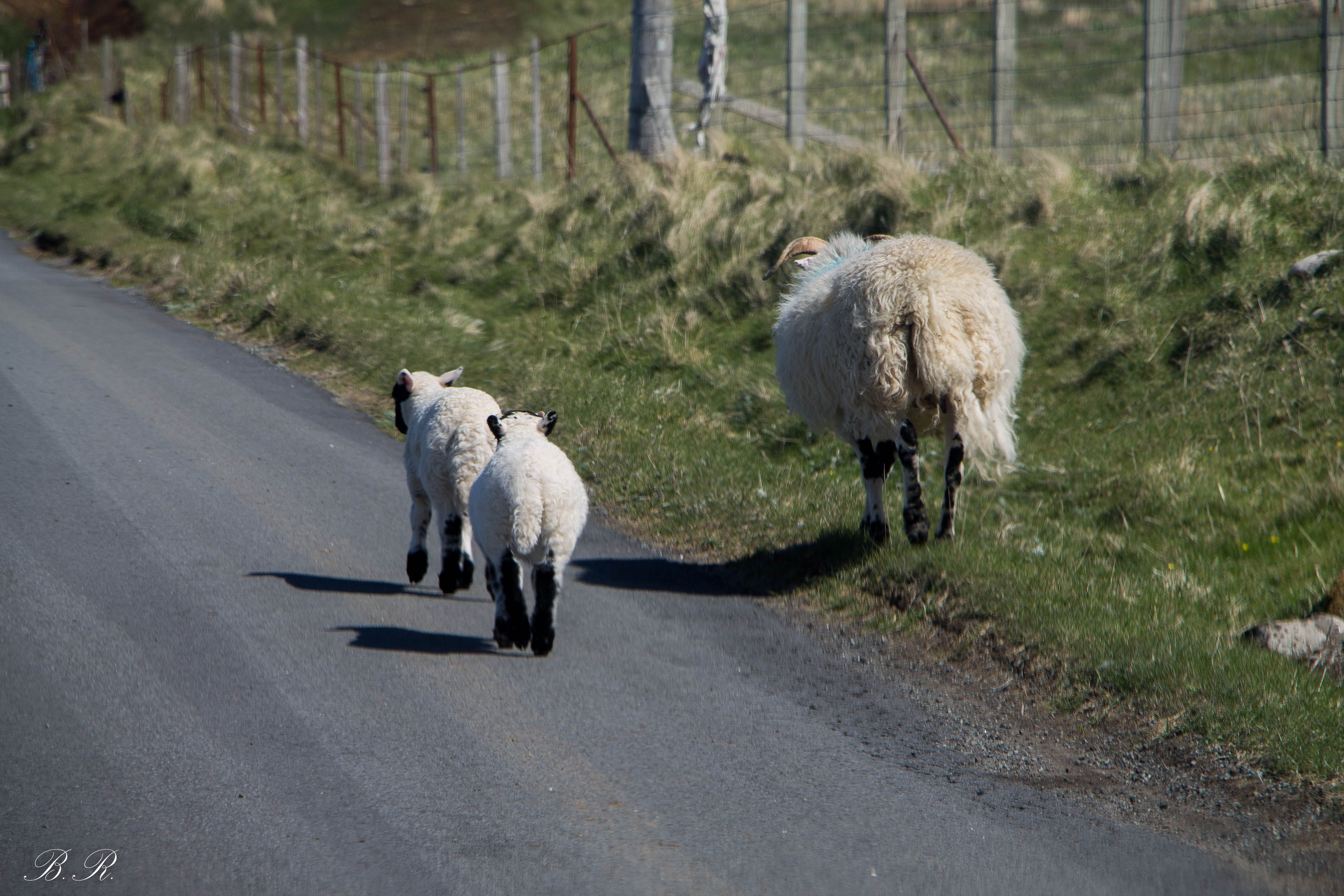 Proseguiamo lungo la costa che a noi, che viviamo tra le montagne tra le montagne e certamente non abituati ai paesaggi marittimi, offre panorami mozzafiato: l’oceano è di un blu mai visto prima, intenso e profondo, incorniciato da alte scogliere e da vastissimi pascoli dove scorazzano una moltitudine di pecore ed agnelli che spesso e volentieri si spingono fin sul ciglio della strada. Raggiungiamo lo Skye Museum of Highland Life, un museo all’aperto che consiste in una serie di abitazioni tipiche dell’isola, bianche e con il tetto di paglia, i cui interni sono stati ricostruiti ed appaiono come erano nel secolo scorso. La posizione è suggestiva, ed il piccolo museo interessante e tranquillo (scolaresca di 40 bambini chiassosi a parte!!!). Ho anche l’occasione di scambiare due parole in gaelico con la signora della biglietteria. Due parole davvero, perché dall’agitazione non mi viene in mente niente da dire e mi limito a un “come va?”, spiegandole che sto provando ad imparare la lingua ma che la trovo molto difficile; lei per confortarmi mi dice, con mia grande emozione, che sto andando bene.