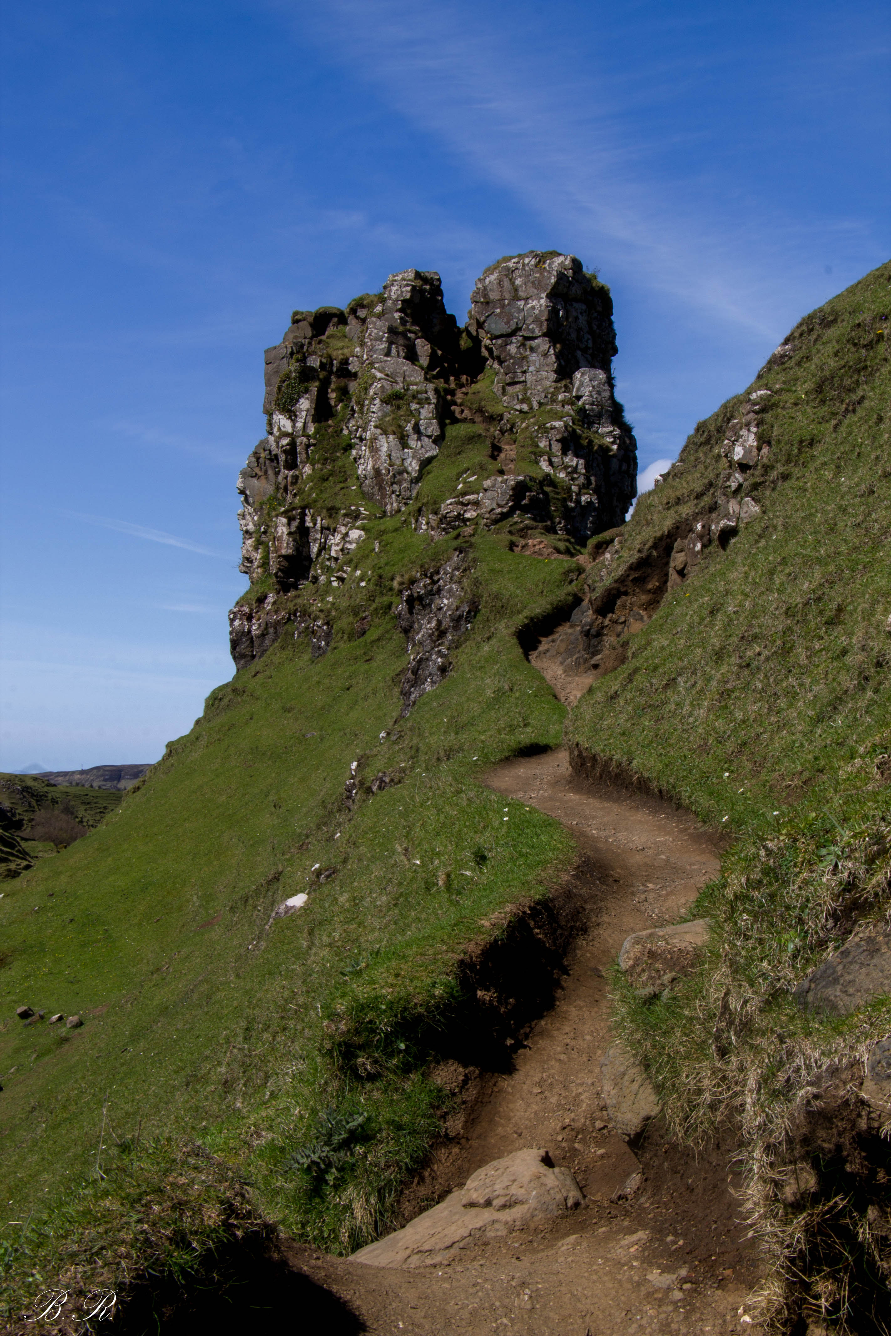 Ci svegliamo con un cielo azzurro e limpidissimo, una giornata climaticamente perfetta di quelle che non ne troveremo più durante tutta la vacanza, che ci invoglia ancora di più ad uscire subito ad esplorare l’isola. Oggi dedicheremo la giornata alla Penisola Trotternish, che dicono sia la più bella di Skye: Non rimaniamo delusi! Ci dirigiamo subito verso Uig, piccolo villaggio di pescatori e da dove partono le navi per le Ebridi Esterne. A poca distanza dal centro abitato si trova il Fairy Glen, una zona caratterizzata da colline con una strana conformazione geologica, tutte a strati, dove i locali affermano che vivano le fate. In effetti il posto ha un non so che di magico e facciamo volentieri una passeggiata sentendoci catapultati in una fiaba. Scalando le colline si passa attraverso un boschetto di strani alberi che non ho saputo identificare, ancora brulli data la stagione e ricoperti di filosi licheni azzurrini, per poi arrivare ai piedi di quello che viene chiamato “Castle Ewan”, una roccia all’interno della quale è stato scavato uno strettissimo sentiero che permette di arrivarci proprio sulla cima. Qualcuno ha costruito delle spirali di pietre all’interno delle quali la gente lascia piccoli oggetti, forse come regalo per le fate. C’è un’atmosfera strana, ci si sente come un po’ osservati mentre si vaga per le colline silenziose.