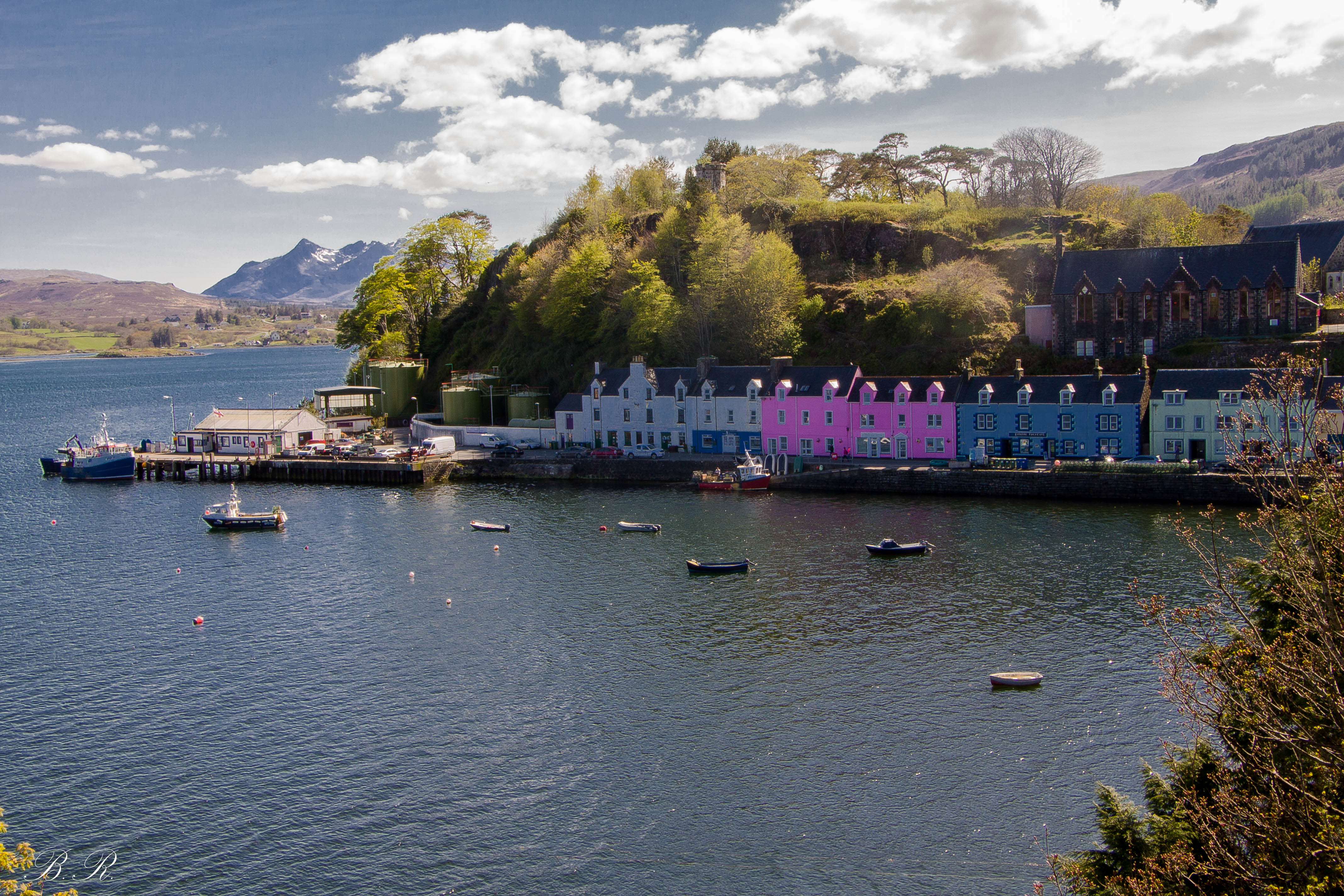 Sorpassato il piccolo villaggio di Staffin ci fermiamo a vedere il Kilt Rock, una scogliera a picco sull’oceano che prende il nome dalla sua somiglianza alle pieghe di un kilt. Dalla cime delle rocce si getta nelle acque sottostanti un’imponente cascata che nasce da un vicino laghetto…proprio un bel tuffo! Proseguendo, ci si avvicina sempre più al famoso Old Man of Storr, un pinnacolo di roccia che dalla strada sembra molto piccolo, ma è in realtà un enorme monolite di 50 metri, e che si raggiunge dal parcheggio lungo la strada con un’escursione di circa 40 minuti. Decidiamo di passare oltre, è tardo pomeriggio e ci sono ancora un paio di cosette che vorremmo vedere prima di sera. Passiamo per Portree, centro abitato più grande di Skye, dove ci fermiamo per scattare qualche fotografie al caratteristico porticciolo colorato.