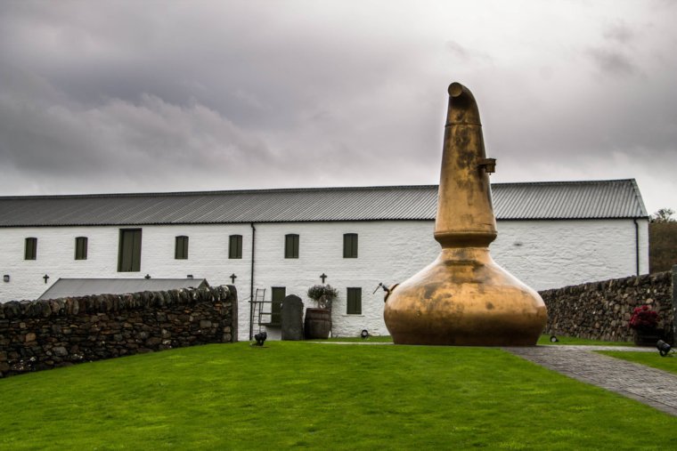 La distilleria Talisker si trova nella parte nord-ovest dell’Isola di Skye e si affaccia sul Loch Harport, che in realtà non è un lago ma una delle tante insenature che si trovano nella zona. Fondata nel 1830 dai fratelli Hugh e Kenneth McAskill, allevatori di pecore che sfidarono l’opposizione del Reverendo del luogo, la distilleria conobbe alterne fortune. La proprietà cambiò più volte e la grande depressione della seconda metà del 1800 la portò alla bancarotta nel 1863: fu rilevata dalla Johnny Walker e prosperò fino al 22 novembre 1960 quando un terribile incendio la distrusse completamente. Una volta ricostruito l’edificio l’azienda entrò nell’orbita della Guiness. Oggi è di proprietà della Diageo, nata dalla fusione tra la Guiness e la Grand Metroplitan. L’edificio, caratteristico, bianco, spicca tra il verde della campagna e l’azzurro della baia in cui è situato e attrae ogni anno migliaia di visitatori. “Made by the sea”, fatto vicino al mare è lo slogan dell’azienda. Il suo whisky, oggi tra i più famosi al mondo, è citato perfino da Robert Louis Stevenson che lo definì “The king of drinks” il re dei liquori nel poema “The Scotsman’s Return From Abroad”.
