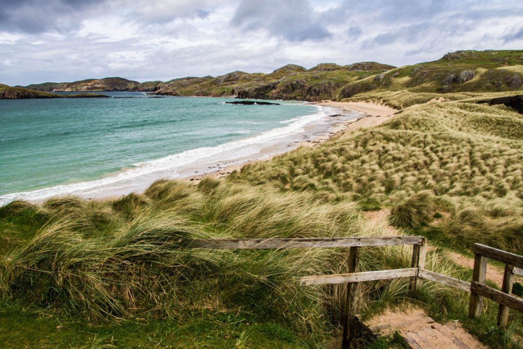 Qualcuno dice che Oldshoremore (conosciuta in gaelico come “Am Meallan”) sia una delle più belle spiagge scozzesi, e non si stenta a crederlo: una volta parcheggiata l’auto in un ampio spiazzo sterrato (con tanto di toilette pubblica, che è sempre utile quando si viaggia!) si imbocca un sentiero che conduce prima a fianco di un piccolo cimitero per poi giungere sopra alla spiaggia, con una vista a dir poco magnifica! Alcuni scalini di legno portano giù fino alla spiaggia, racchiusa in promontori rocciosi, passando attraverso un’area coperta di dune di sabbia, uno dei migliori esempi di machair sulla mainland scozzese!