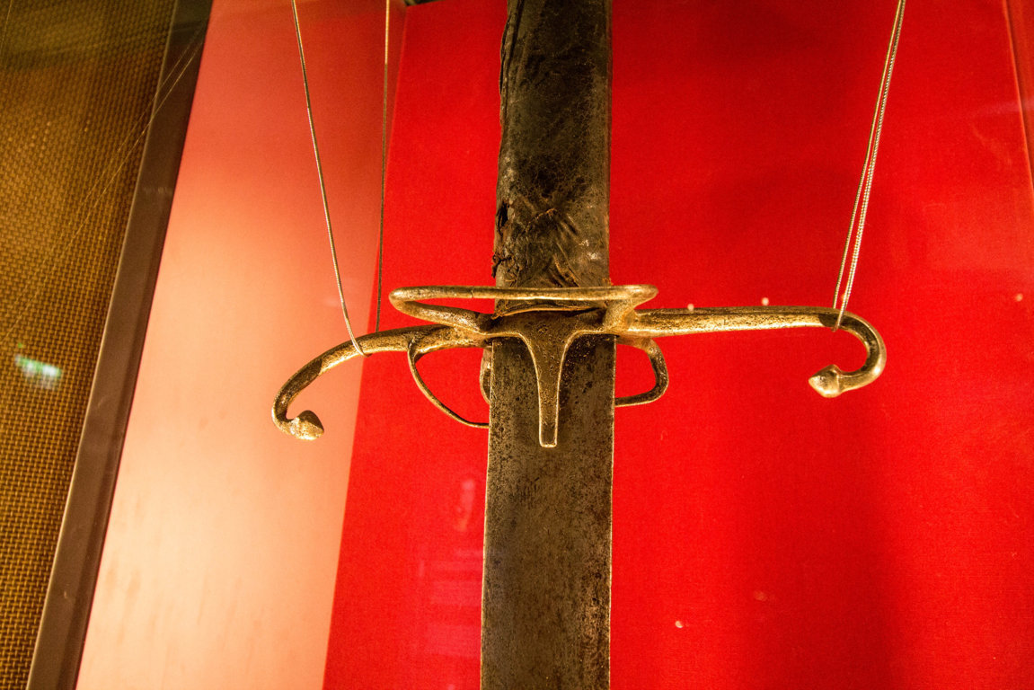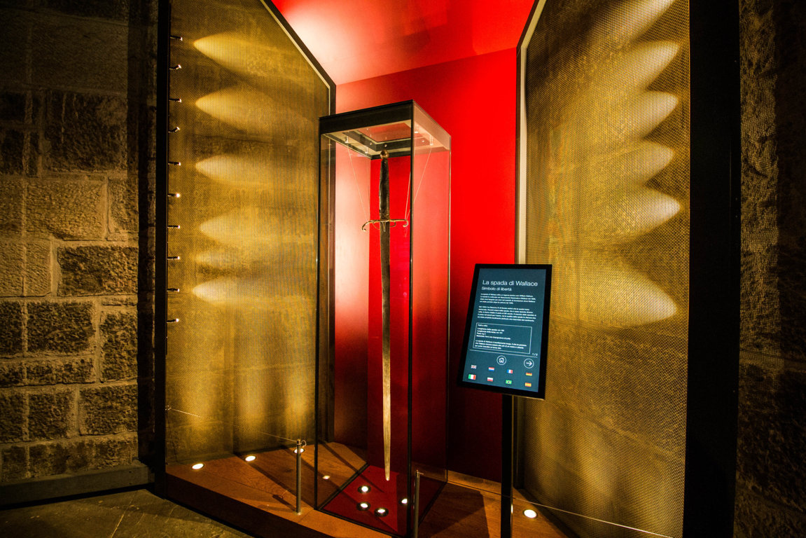 Al suo interno il Wallace Monument è diviso in 4 piani, collegati tra loro tramite una strettissima scala a chiocciola di 264 scalini. I piani sono la Sala d’armi, la Sala degli Eroi, la Sala Reale e la Corona. Nella Sala d’armi viene raccontata, tramite un video, la storia di Wallace e il suo ruolo nelle Guerre di Indipendenza Scozzesi. Qui si trova esposto in una teca di vetro lo spadone che, si dice, sia appartenuto proprio a Wallace: l’antica arma che si usava con due mani è alta 1.68mt e pesa 3kg. Fu rinvenuta per la prima volta nel castello di Dunbarton nel 1505, nello stesso castello dove Wallace fu tenuto prigioniro dopo la sua cattura avvenuta nel 1305.