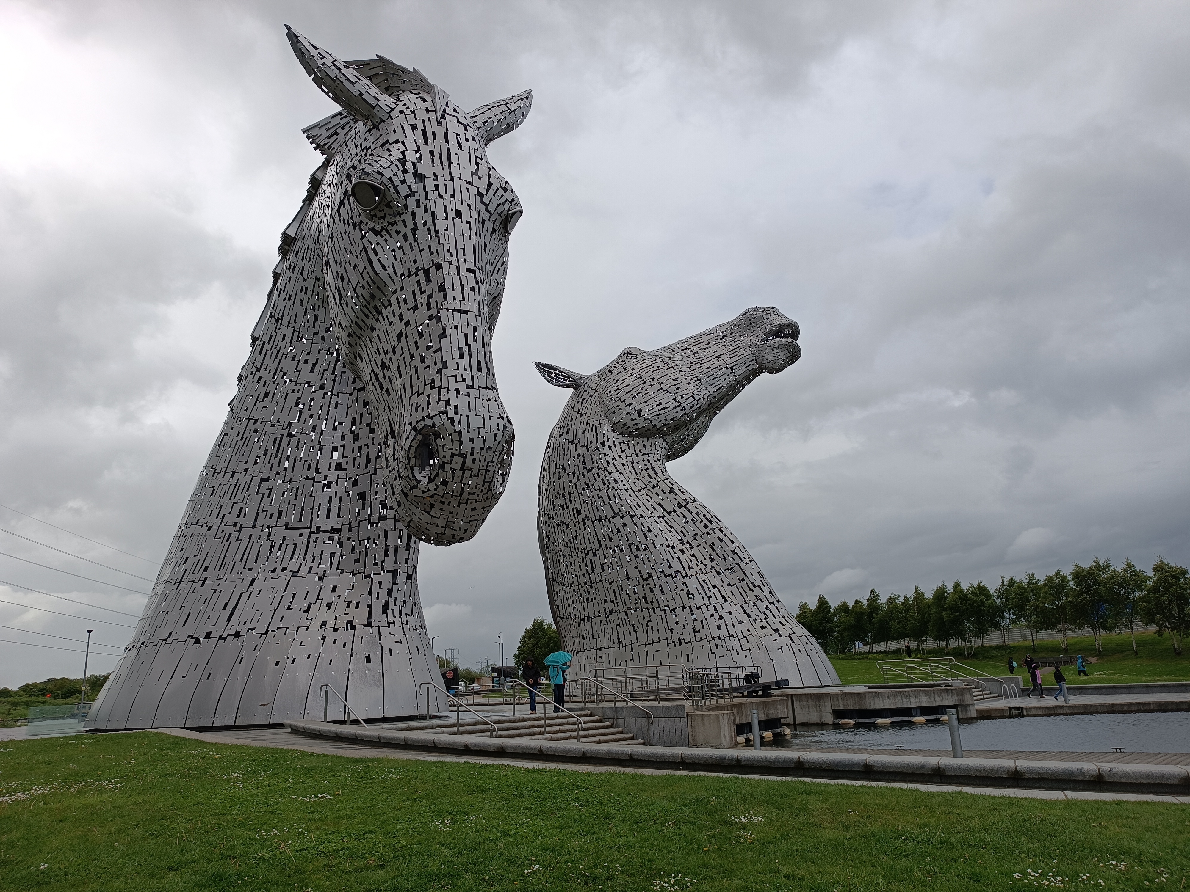 Se siete stati in Scozia e avete preso la M9 che da Edimburgo porta verso Nord, verso Stirling, avrete sicuramente notato due enormi statue a forma di testa di cavallo spuntare a lato della strada all’altezza di Falkirk: si tratta dei The Kelpies, le statue equestri più grandi del mondo, situate all’interno dell’Helix Park. Le due statue sono alte 30 metri, pesano 300 tonnellate ciascuna e sono state realizzate dall’artista e sculture Andy Scott nel 2013: hanno una struttura portante di acciaio e sono ricoperte da quasi 1000 piastrine di acciaio inossidabile, posizionate individualmente con cura ed attenzione, che le fanno sembrare un pò un puzzle. Sono imponenti e magnifiche, con un cavallo che guarda verso l’alto e uno che invece punta lo sguardo verso il basso, e trovarcisi sotto fa sentire davvero piccoli piccoli! Le statue sono collocate accanto a due laghetti artificiali e il loro riflesso nell’acqua le fa sembrare ancora più grandi!.