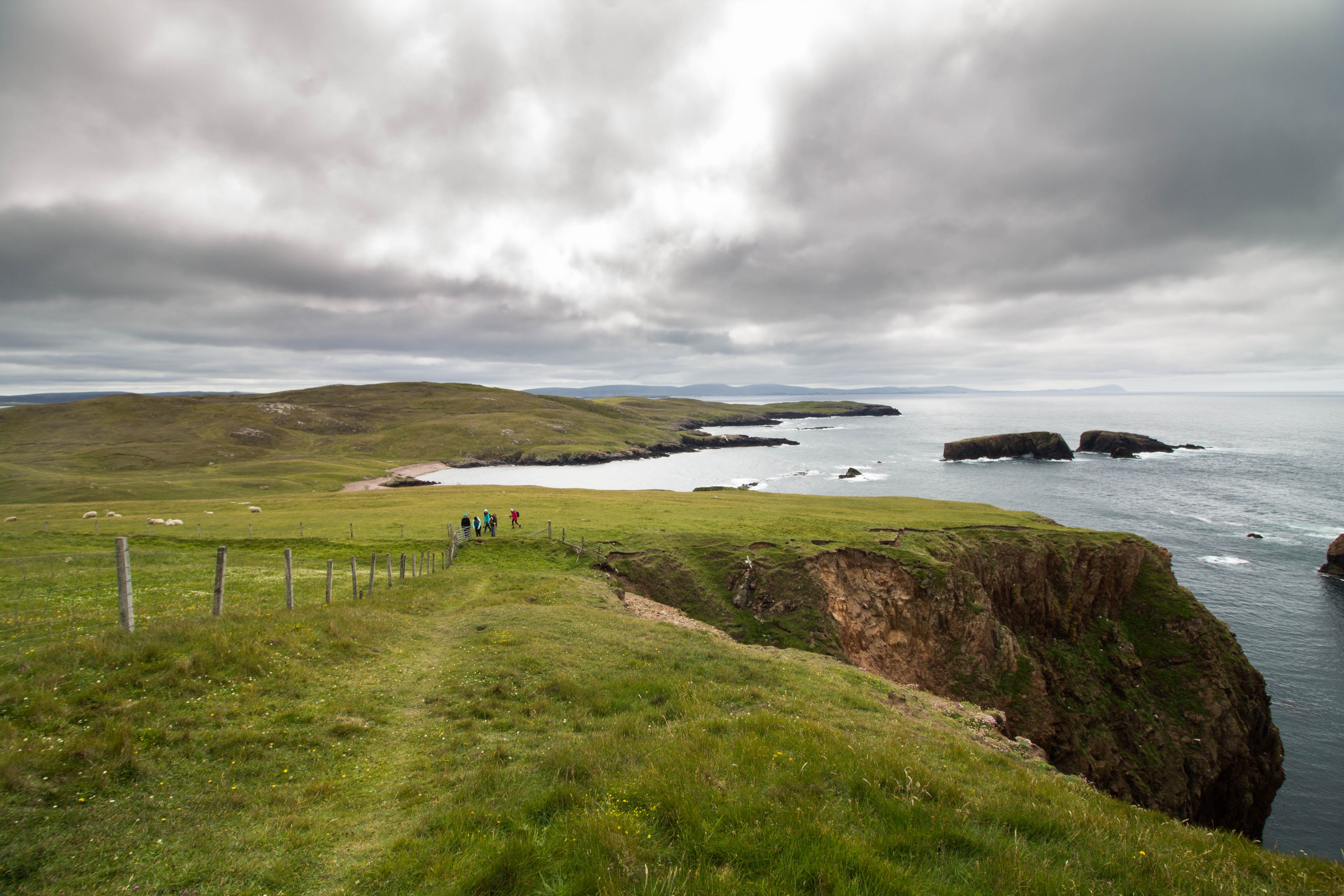 Il sentiero per iniziare il percorso si imbocca accanto al St. Magnus Church Cemetery (qui su google maps): nel primo tratto si attraversano alcuni pascoli per le pecore, si sorpassa la spiaggia Sand Wick e si inizia quindi a caminare lungo le scogliere: la vista spazia su panorami ampi ed affascinanti, colline verdeggianti e cieli ricchi di nuvole. In leggera pendenza, ma mai troppo impegnativa, si raggiunge una collinetta sulla quale si trova bellissimo viewpoint su un gruppo di scogli conosciuti come Cliffs of Zoar (quello nella prima fotografia qui sopra). Da qui noi abbiamo deciso di tornare indietro sui nostri passi altrimenti è possibile continuare a seguirei il sentiero.