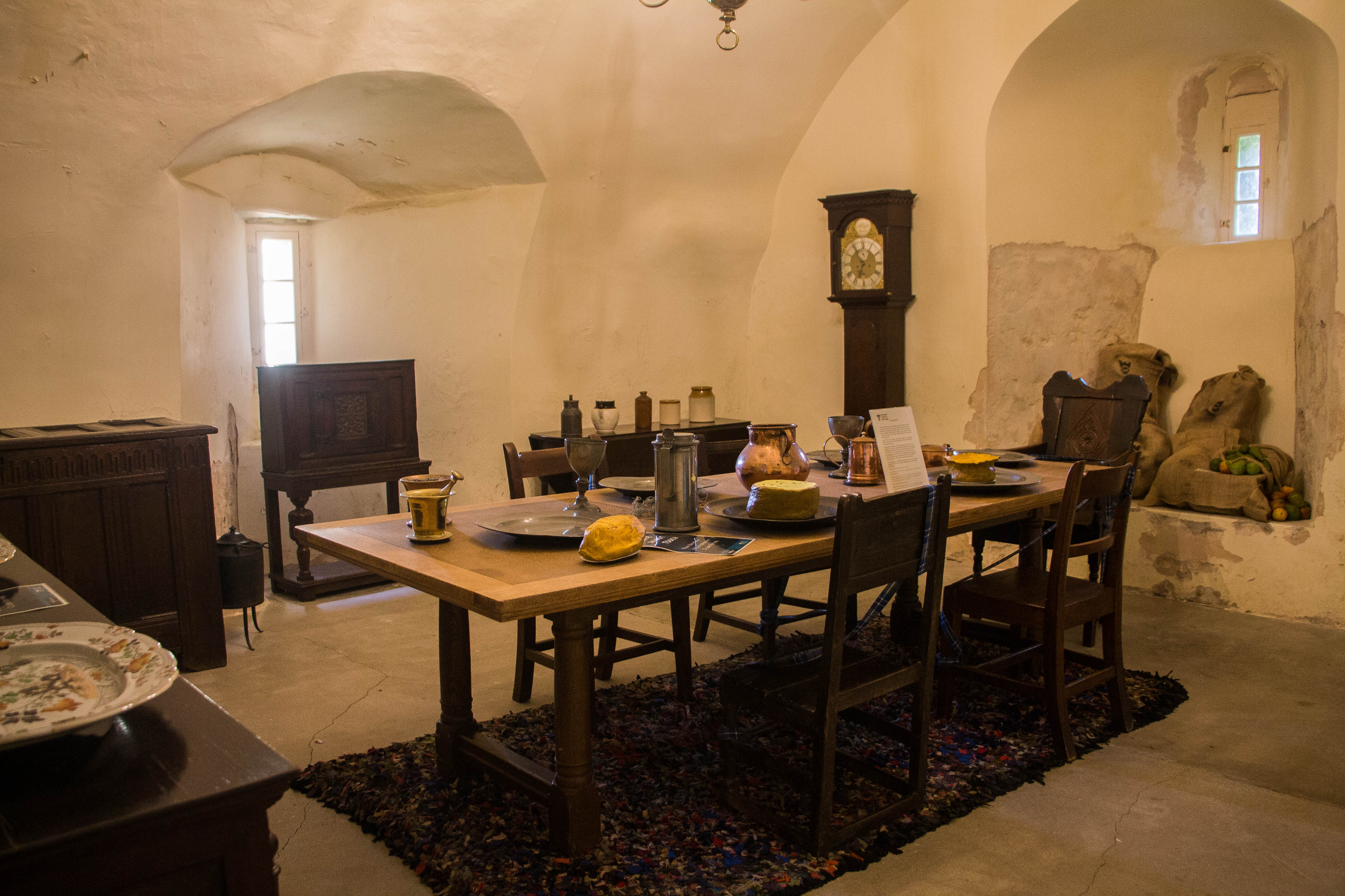 La visita di Crathes Castle inizia entrando nella Hall che si trova nella nuova ala del castello e procedendo verso la Tower House dove si incontrano per prime le cucine: esse si trovano al piano terra, ricavate in alcune buie stanzette dai soffitti a volta, ed ospitano anche una piccola cella dove eventuali prigionieri venivano tenuti prima di essere processati dal Laird. Se durante la vostra visita vi chiederete come mai tutte le stanze sono tenute così buie è per via della delicatezza del mobilio originale del XVI secolo e dei quadri e ritratti della famiglia Burnett. Per preservarli è necessario proteggerli dalla luce!