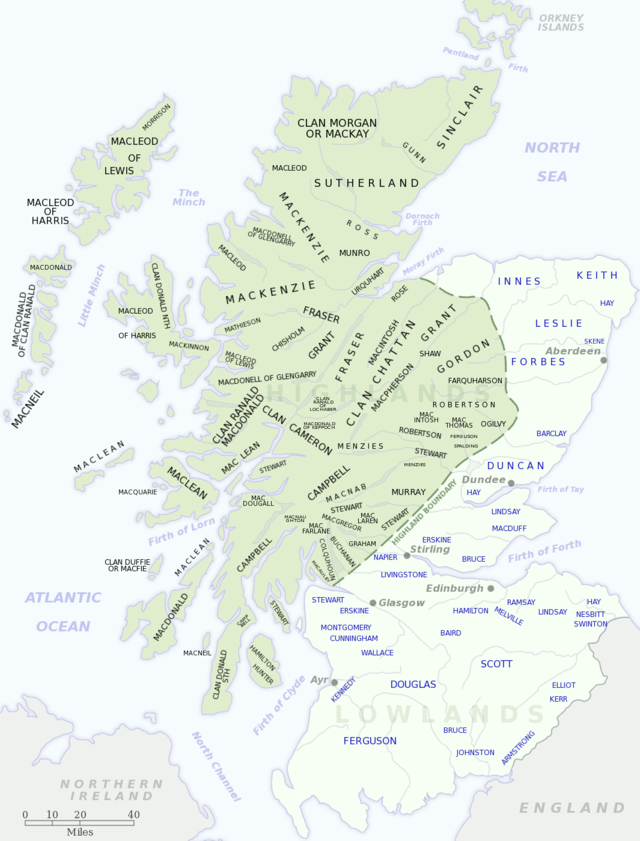 Le Highlands, a differenza delle Lowlands, erano divise territorialmente tra i vari Clan, tanto che alcuni capi divennero famosi per il loro dominio su determinati territori: alcuni esempi sono i Macdonalds sulle isole, i Campbell nell’Argyll, i MacLeods a Skye. Originariamente con il termine Clan si designavano i discendenti di una determinata famiglia, il gruppo di persone che costituiva la stirpe di un capo, con tutte le sue diramazioni. Con il tempo il significato del termine si modificò fino ad indicare l’insieme di famiglie che facevano riferimento ad un unico capo, il quale esercitava su di esse il proprio potere governando con le prerogative tipiche di un capotribù, e la cui figura, per i membri del suo gruppo, era quasi più importante del Re stesso. L’appartenenza ereditaria ad un Clan veniva trasmessa attraverso il cognome del padre e quindi un figlio ero membro del Clan paterno, e non di quello materno. Tuttavia, erano frequenti i casi in cui qualcuno decideva di prendere il cognome materno e quindi il Clan di appartenenza della madre.