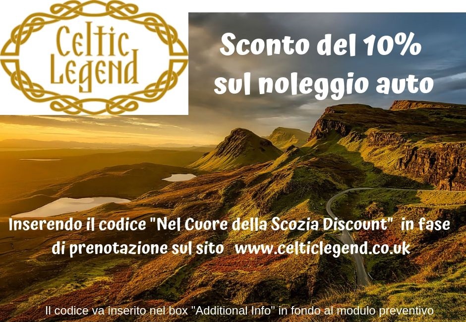 Usando il codice “Nel Cuore della Scozia Discount” riceverai uno sconto immediato del 10% sul noleggio auto 🚗 con Celtic Legend Ltd, uno degli auto noleggi più conveninenti della Scozia e partner di Arnold Clark. Basta inserire il codice nel box “additional Info” quando richiedete un preventivo o comunicarlo in fase di prenotazione 🤩